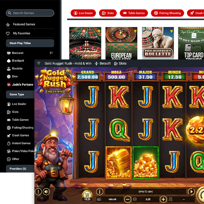Includes a huge selection of popular slots and digital table games that include multiple variants of Poker, Blackjack, Roulette, Crabs, Plinko, Fishing and more.