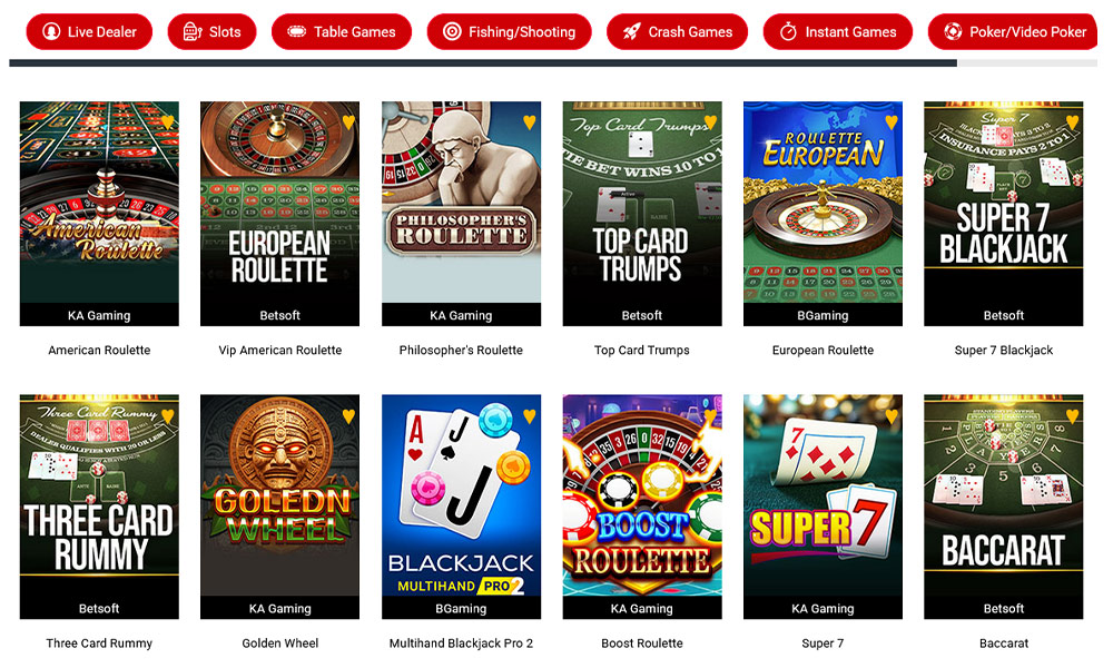 Includes a huge selection of popular slots and digital table games that include multiple variants of Poker, Blackjack, Roulette, Crabs, Plinko, Fishing and more.